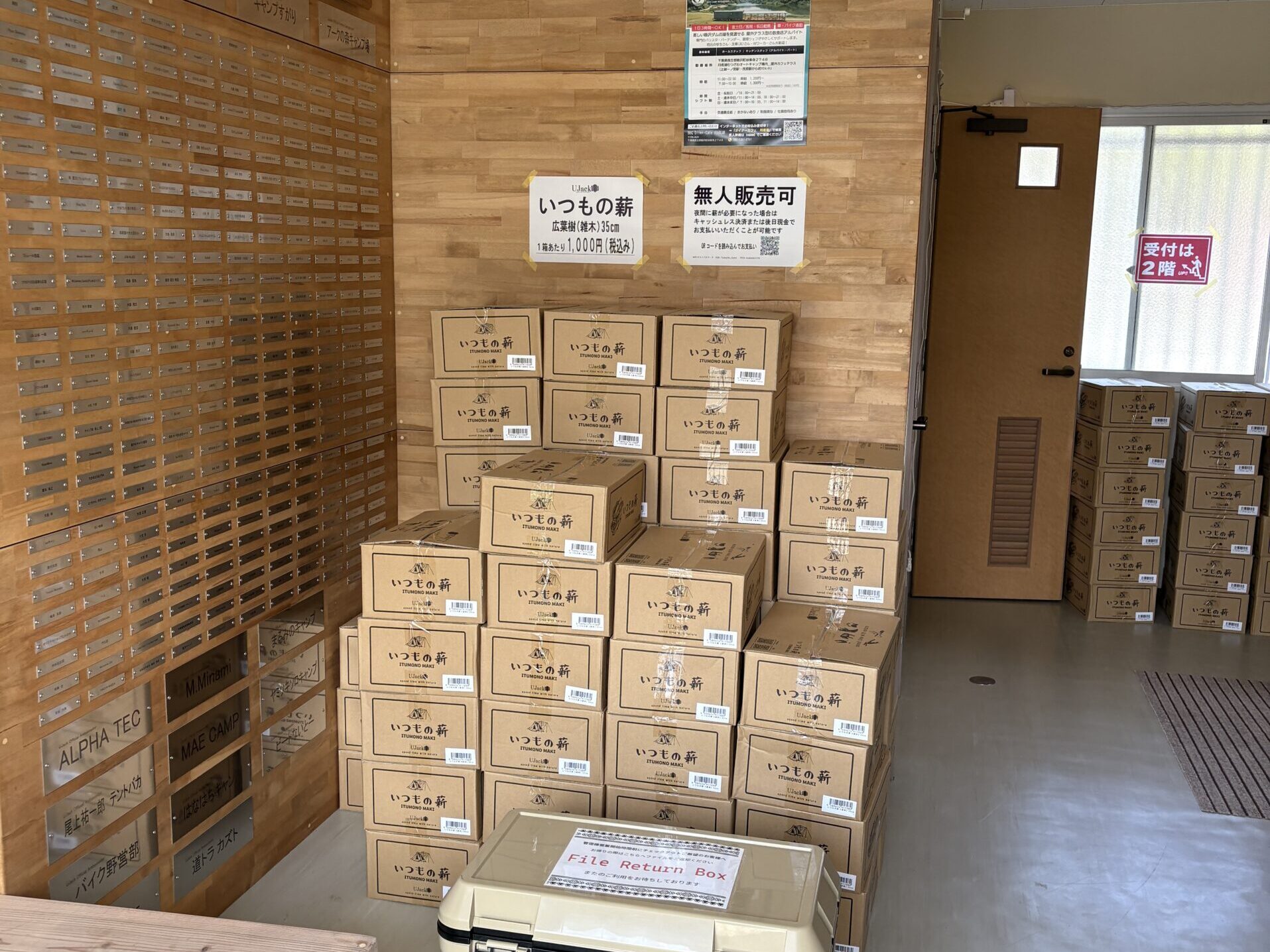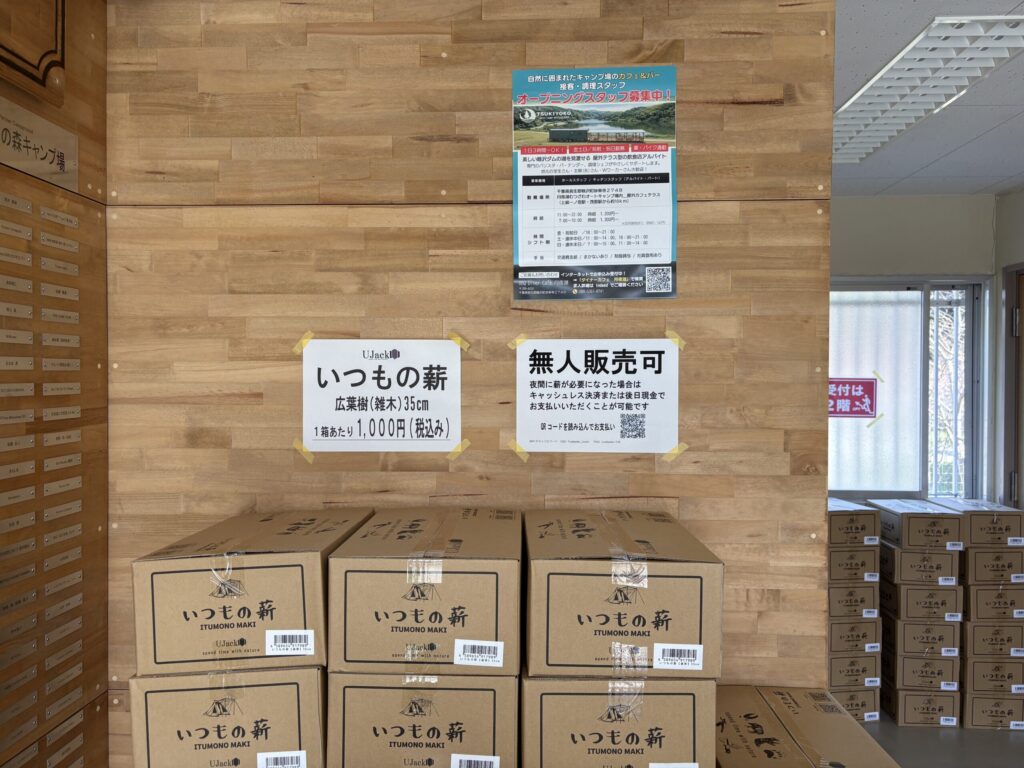 そして、個人的に一番感動したんですがこのキャンプ場では管理棟が閉まったあとでも薪を購入することができます。いつも売店が開いている時間までに薪を多めに買って、思ったより使わなかったので最後キャンプファイヤーみたいになったり、逆にもうちょっと欲しかったな〜と言う時があるかと思うのですが、このキャンプ場では欲しい時に欲しいだけ買うことができます!ちなみに薪は広葉樹のみでしっかり硬かったです。