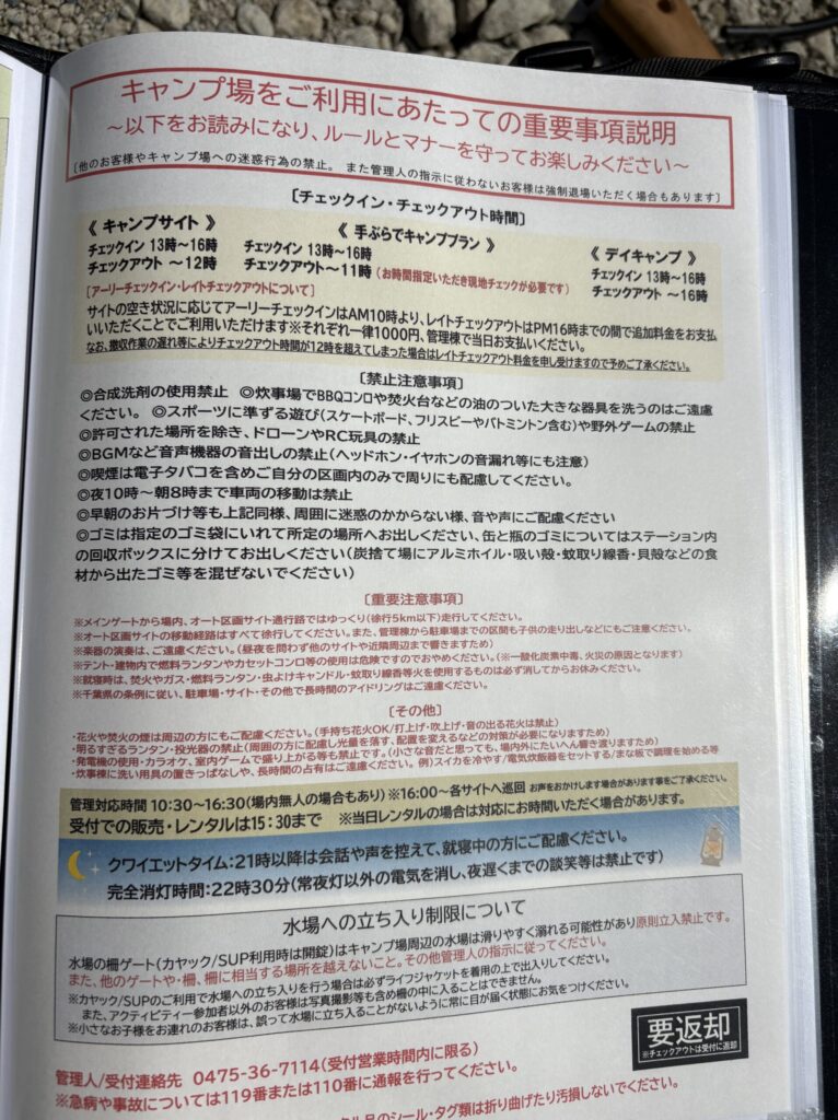 チェックアウト時間や方法を始めとしたキャンプ場利用にあたっての説明って、なかなか覚えてなかったりするものですよね。こちらでは情報がも網羅されたファイルが1組ずつ渡されるので非常に安心できます。