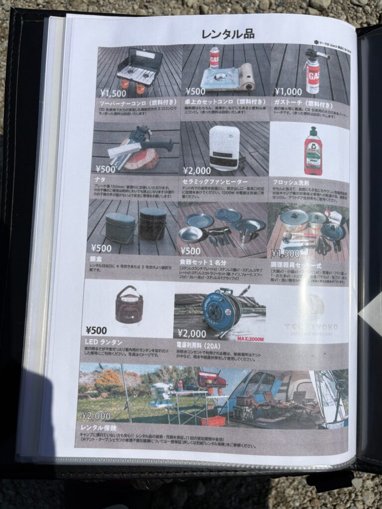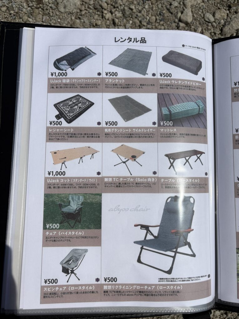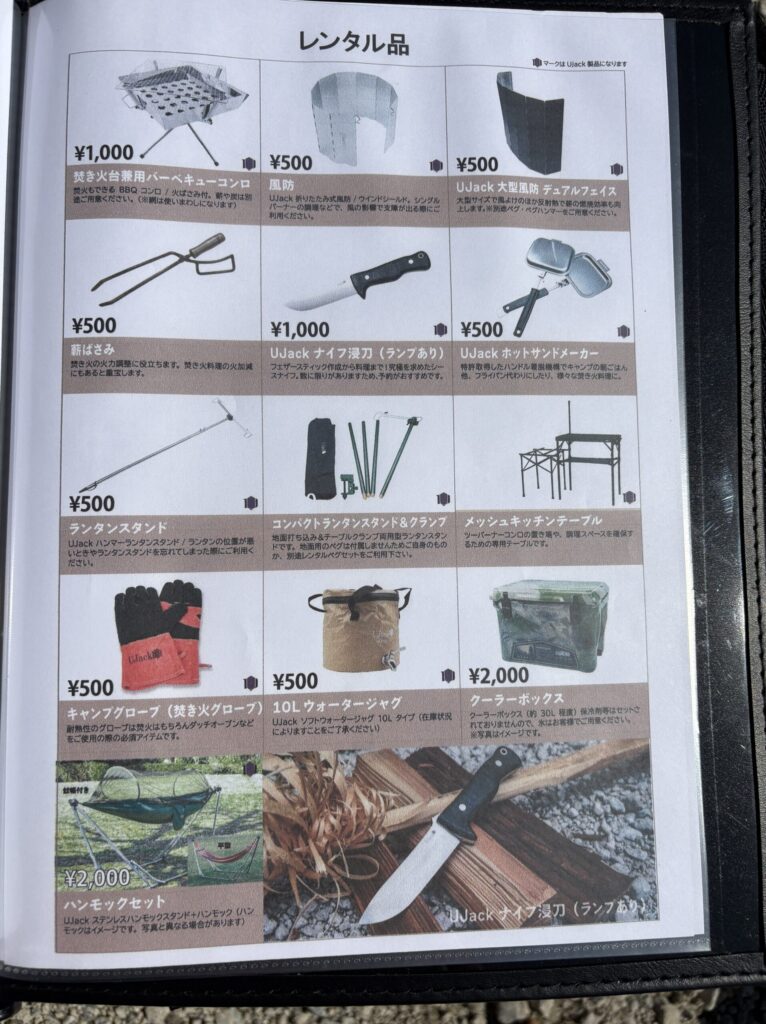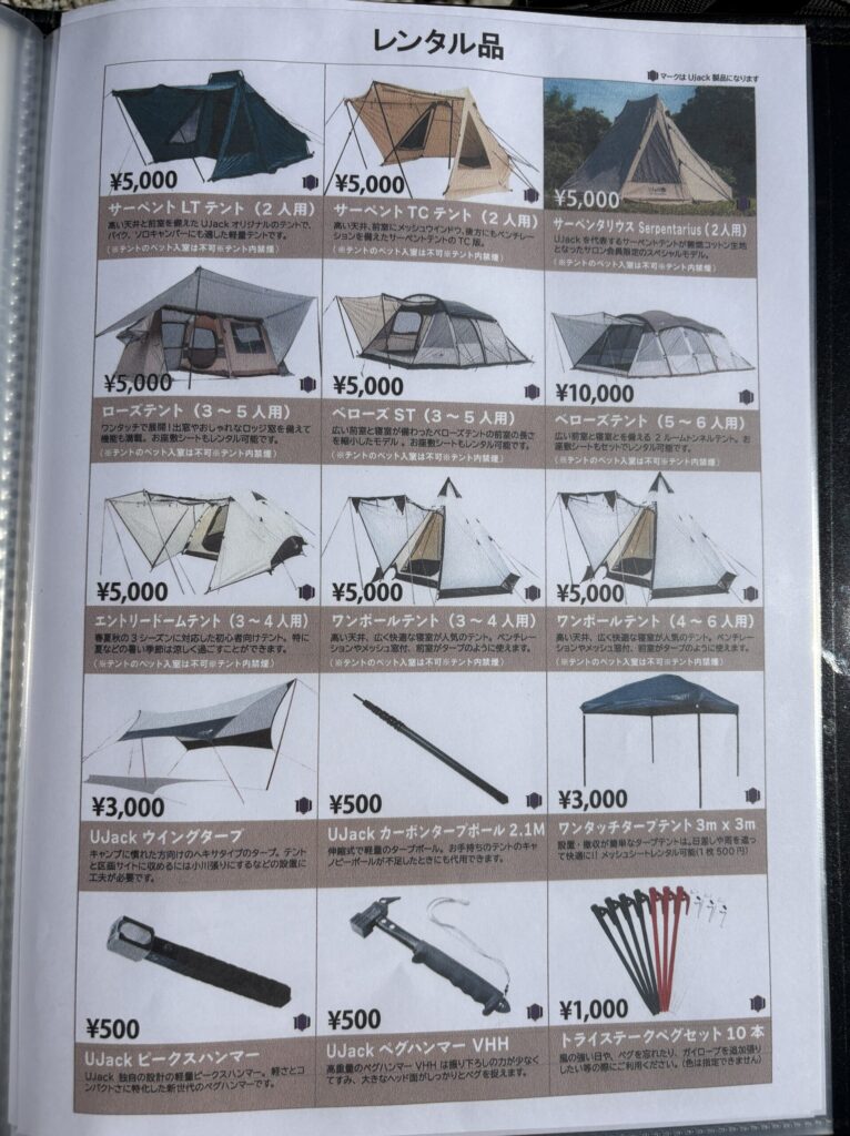 そして、そのファイルにはレンタルできる道具が全て写真付きで掲載されています。UJackが運営するキャンプ場なので、同社の商品も当然多数取り揃えています。レンタルしなくても道具が揃ってる人もちょっと気になっている商品があればレンタルできますよ!