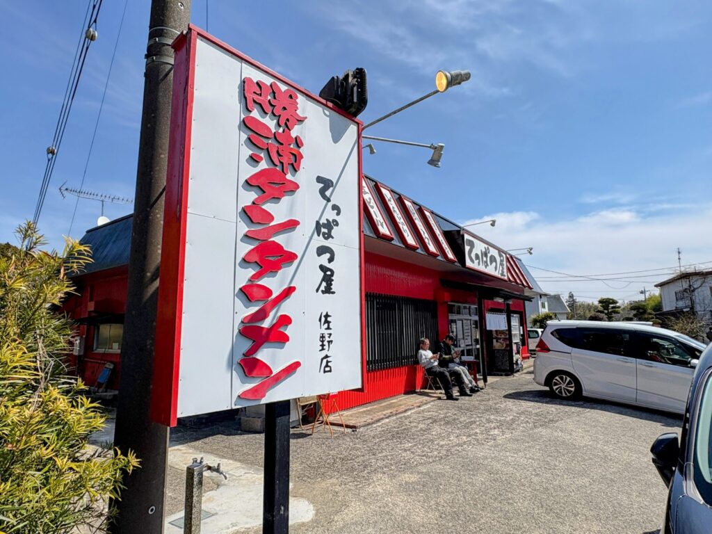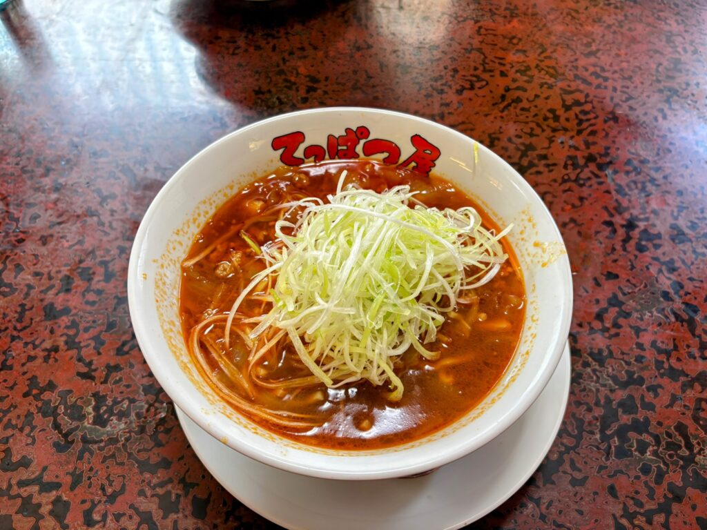 2日目は30分ほどバイクを走らせ勝浦タンタンメンを食べにいきました。勝浦タンタンメンご存じでしょうか?辛くてニンニクの効いたスープに太麺と大量のネギを絡めて食べる勝浦のご当地ラーメンです。今回はキャンプ場から一番近くにあってレビューも高かったてっぱつ屋佐野店に行ってみました!